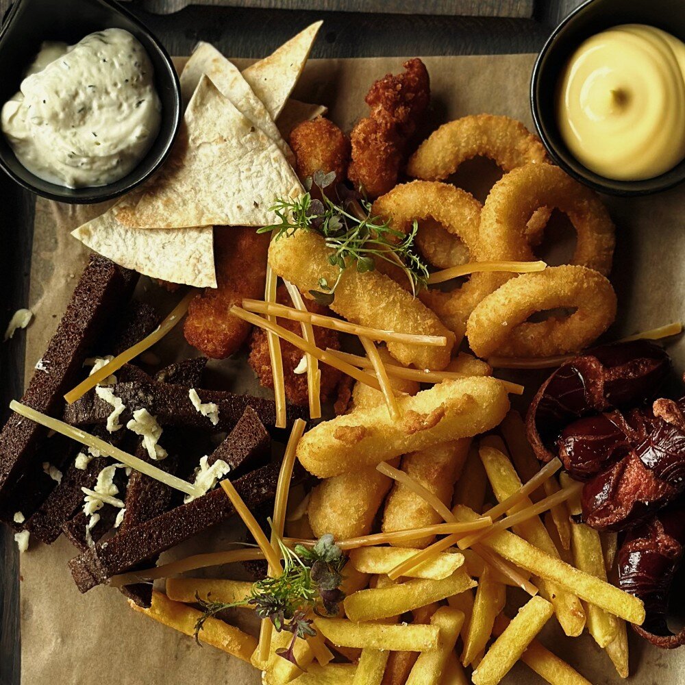 Гренки, сырные палочки, хрустящие куриный палочки, луковые, кольца, фри колбаски. Соус чесночный, сырный