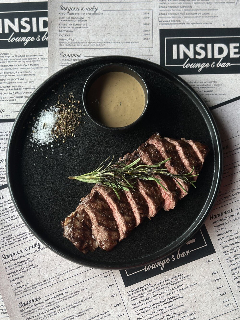 Стейк из внешней диафрагмы мраморной говядины, перечный соус