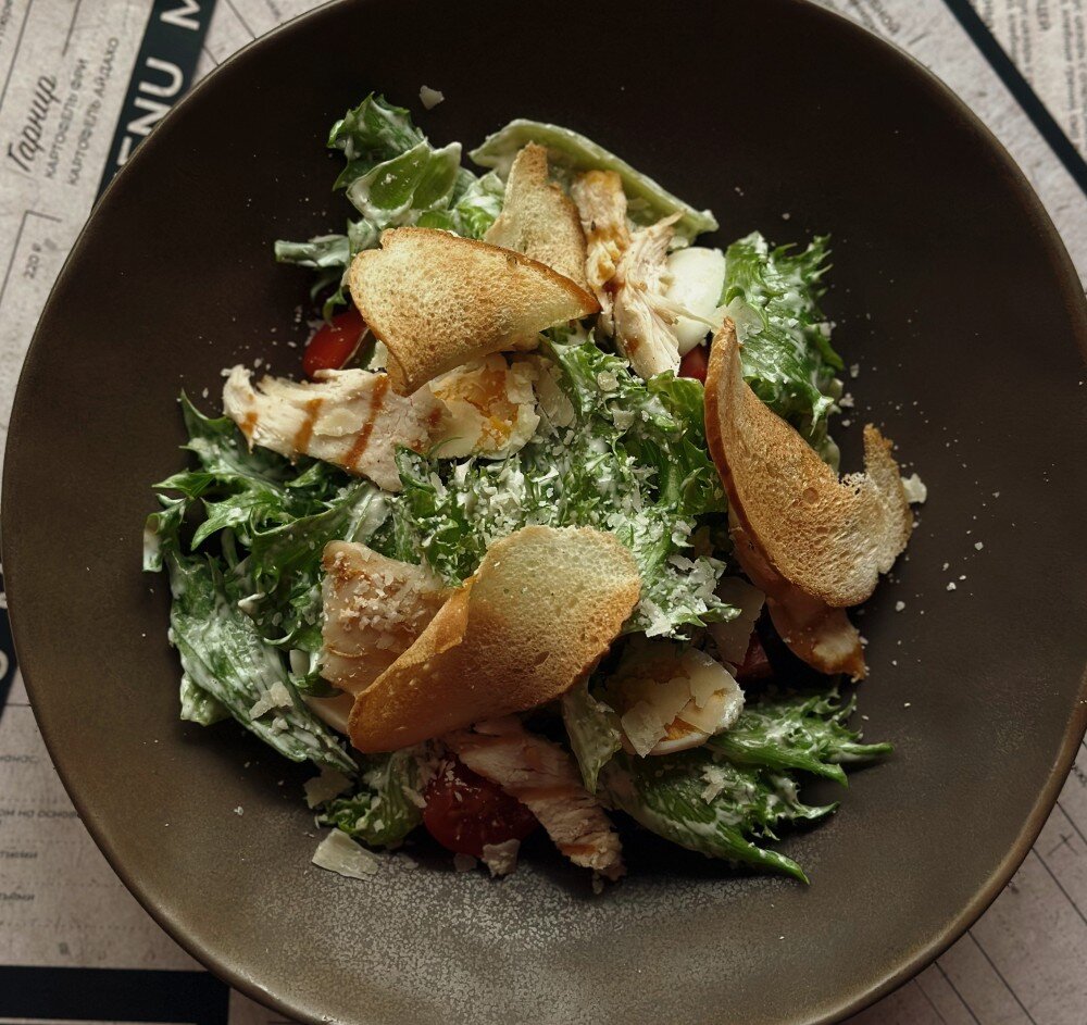 Микс салатов, соус цезарь с апельсином, курица, черри, перепелиное яйцо, пшеничные гренки, пармезан