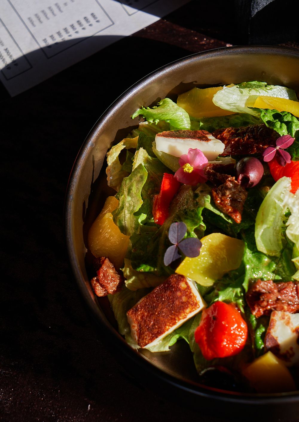 Микс салатов, халлуми, оливки, печеный перец, персик, вяленые томаты, медово-горчичная заправка
