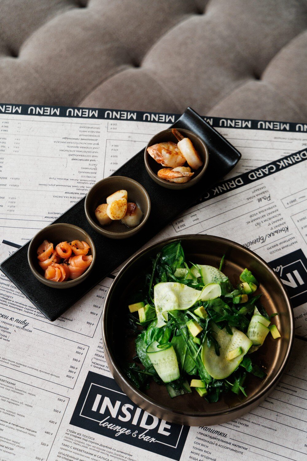 Руккола, шпинат, авокадо, огурец, цукини, заправка с экстрагоном