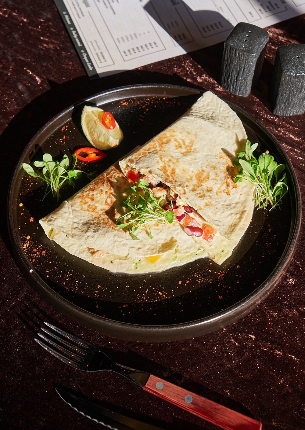 Свинина медленного томления, соус халапеньо, чеддер, томатная сальса с луком, фасоль
