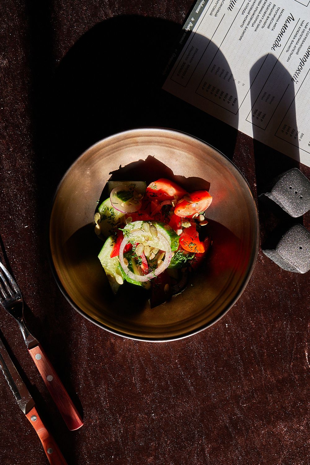 Помидоры, огурцы, болгарский перец, лук красный, зелень, ароматное масло, тыквенные семечки
