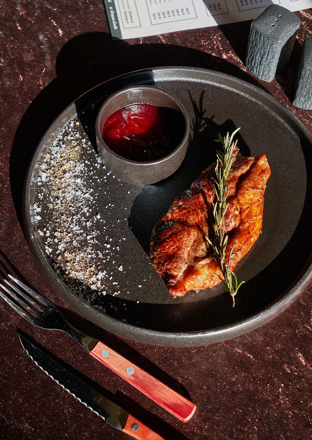 Стейк из мраморной говядины с естественной жировой прослойкой, клюквенный соус