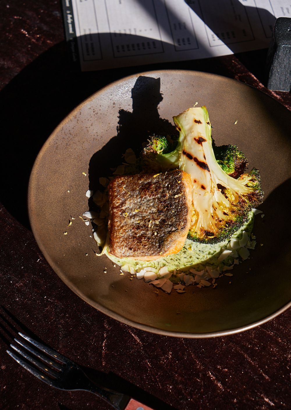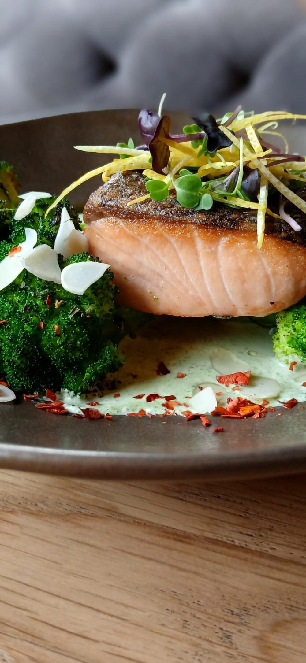 Брокколи, сливочный песто из разных трав, лепестки миндаля