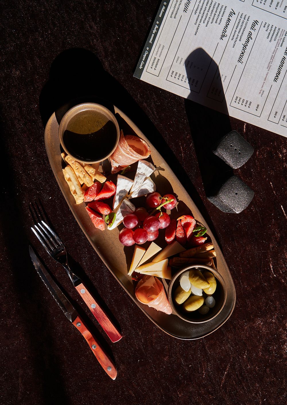 Пармезан, камамбер, мини-салями, сыровяленая шейка, оливки, виноград, чиполлине, гриссини, мед