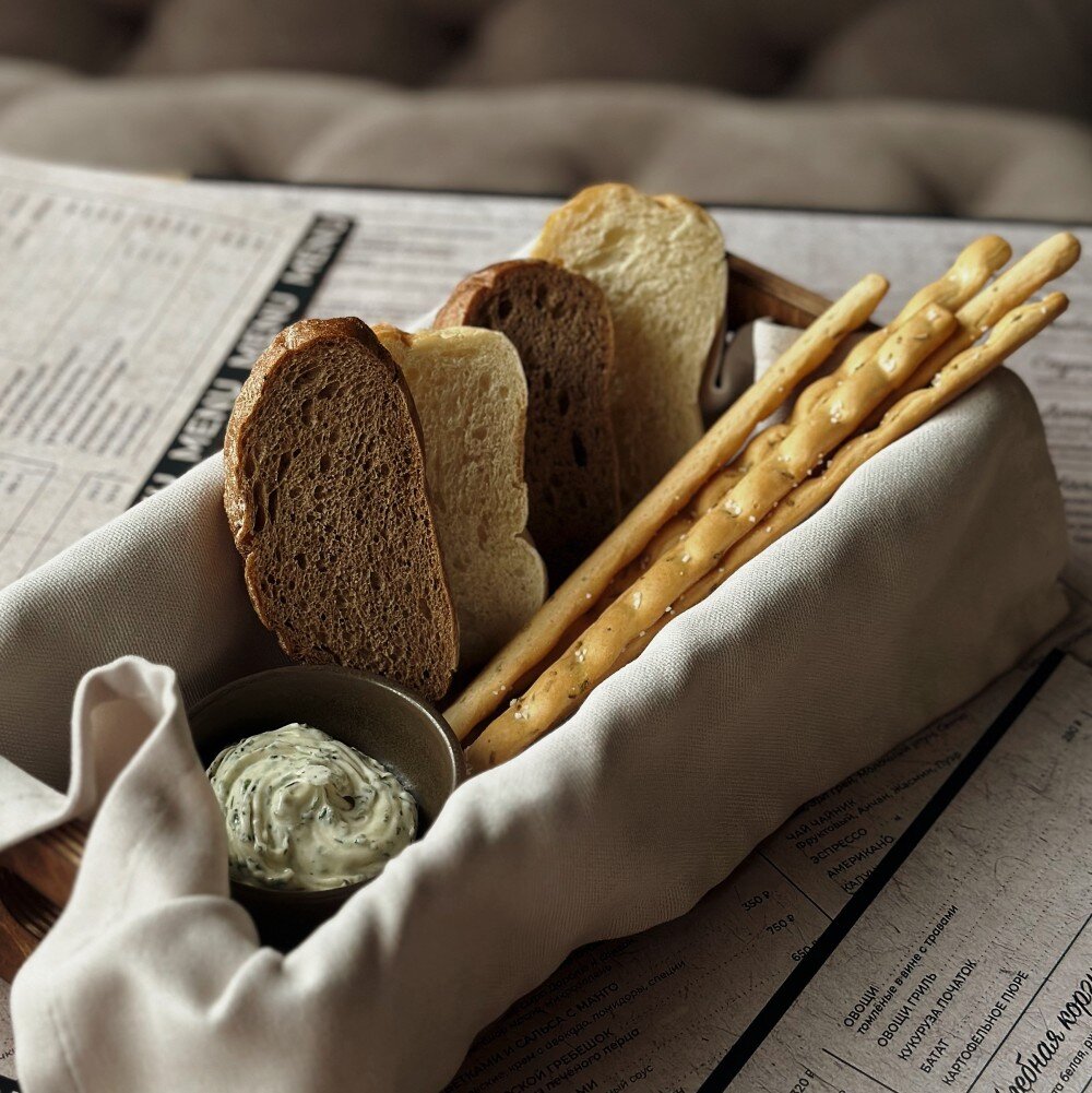Чиабатта белая, чиабатта ржаная, гриссини, взбитое масло с зеленью