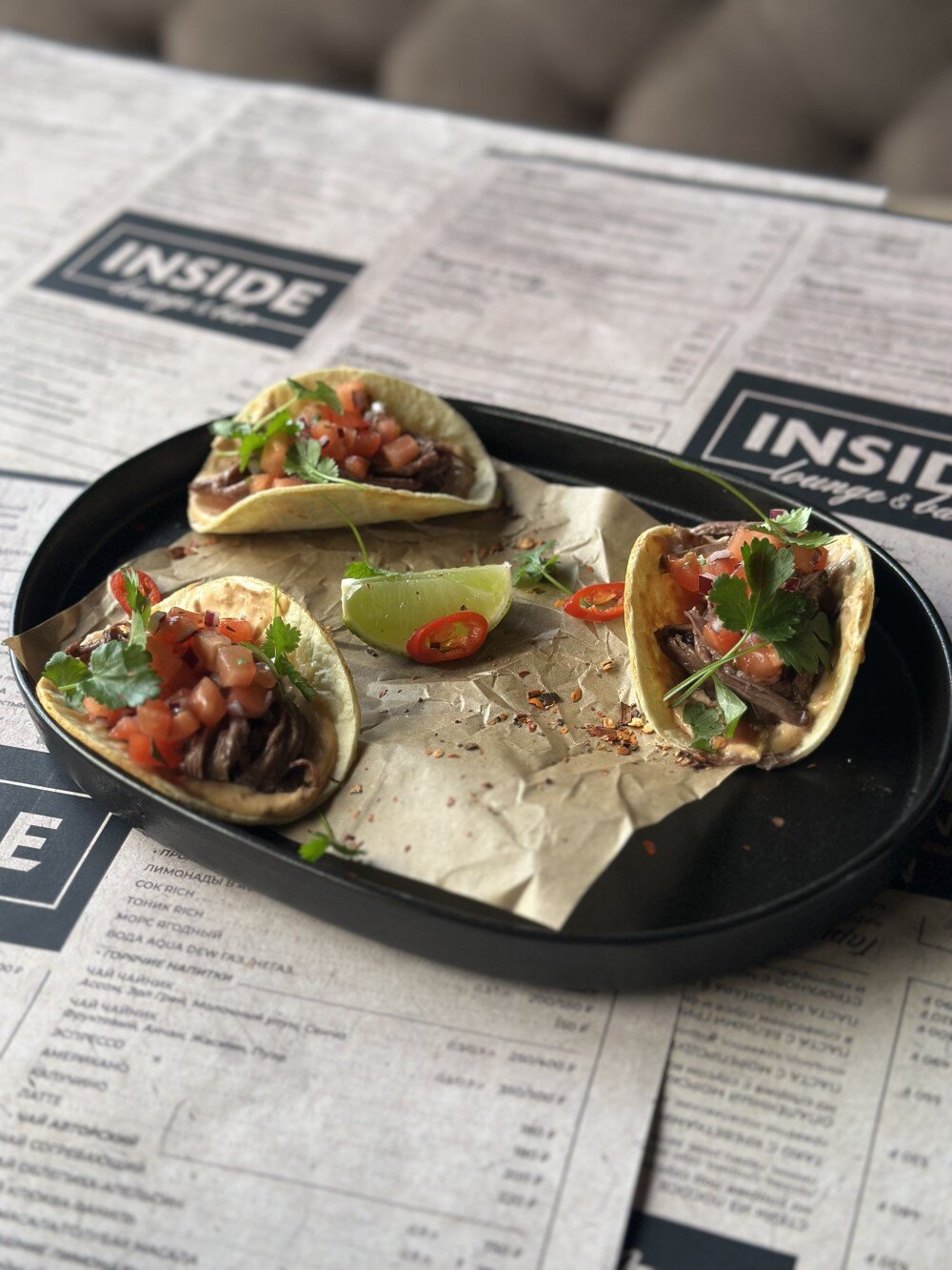Томленая говядина, соус из копченого острого перца, томатная сальса с луком