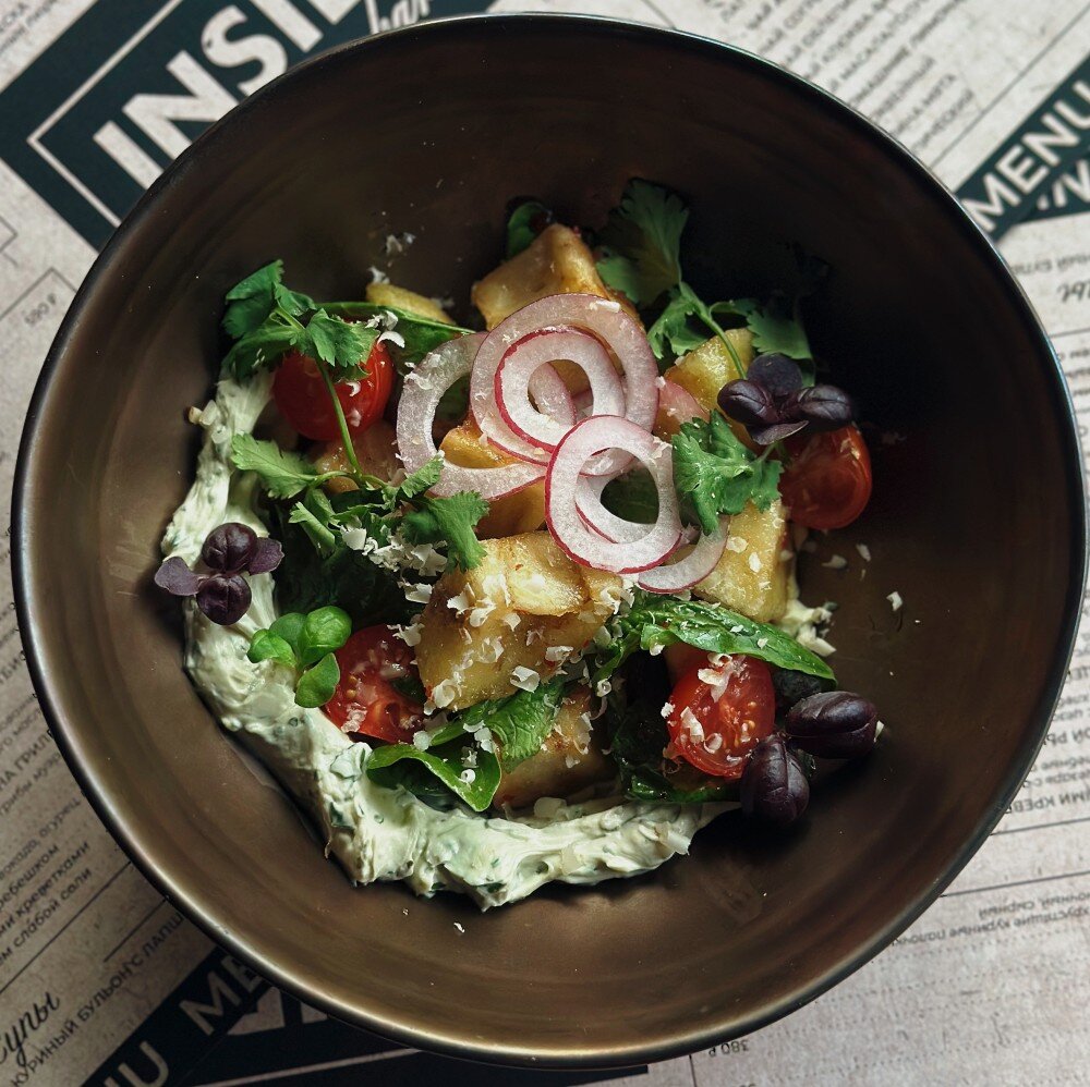 Баклажан, творожный крем с травами, лук красный, шпинат, черри, кинза, грецкий орех